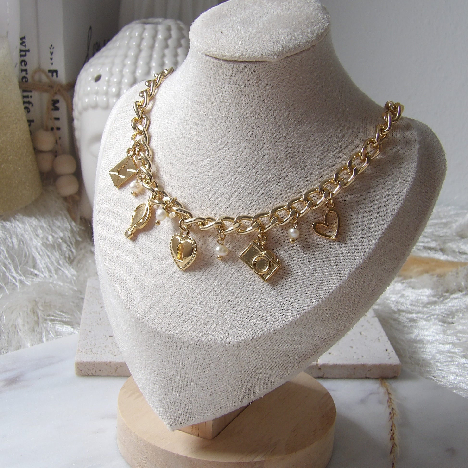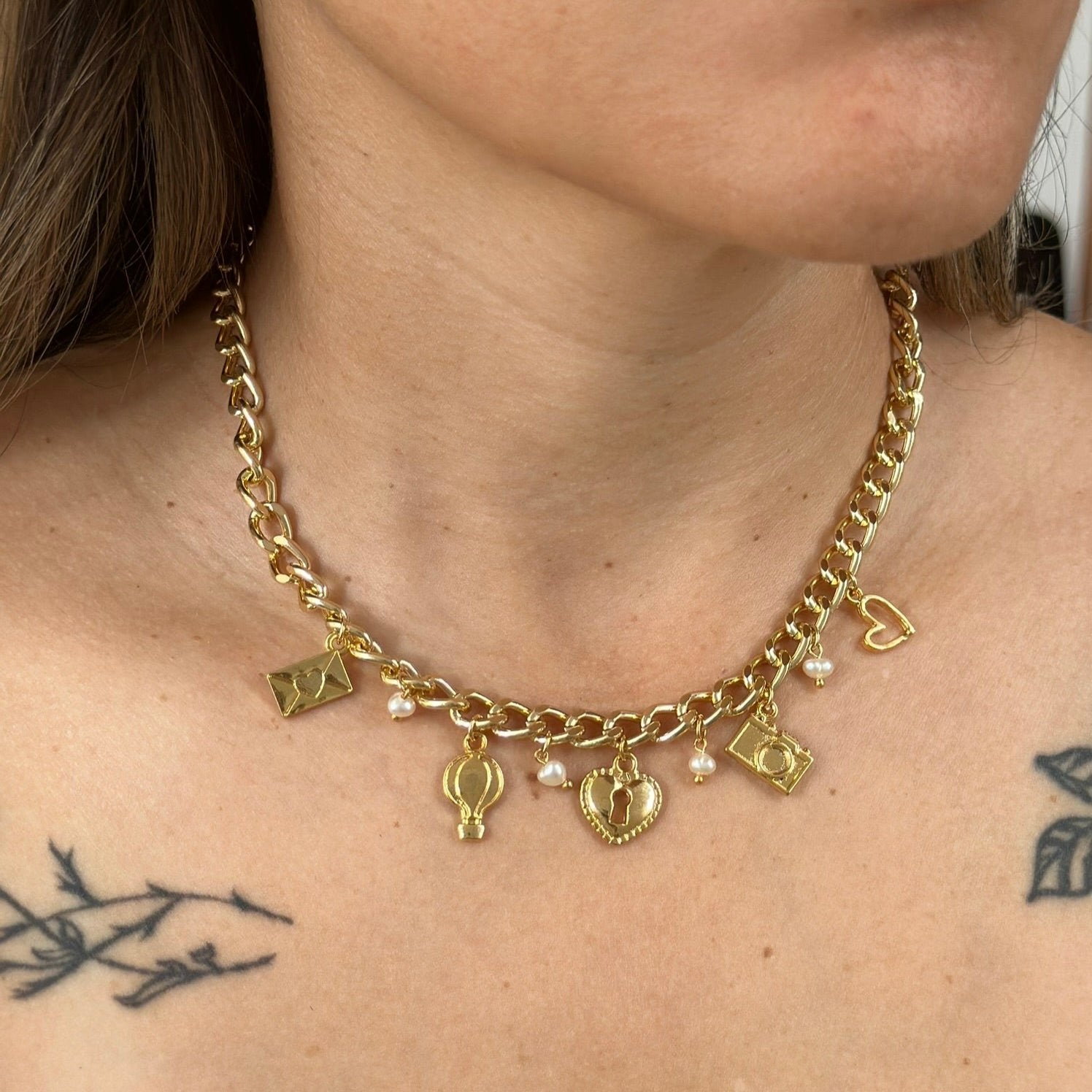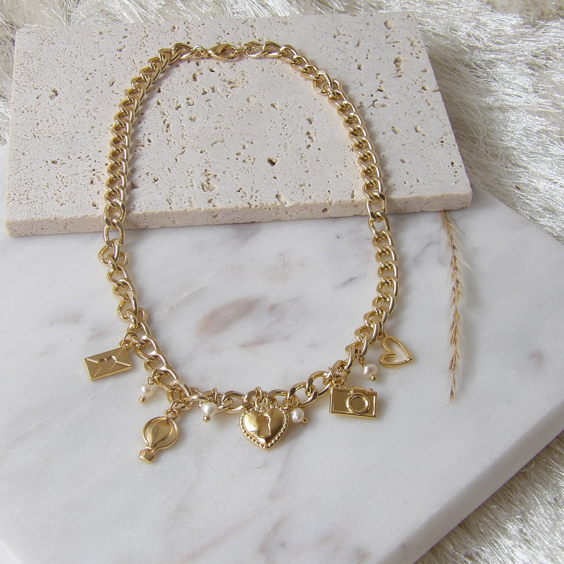 Add a touch of whimsy to your wardrobe with the TURIST NECKLACE GOLD. Made with GOLDFIELD and adorned with a delicate LITTLE MOTHER PEARL, this necklace is perfect for any occasion. The BEAUTIFUL CHAMS bring a playful and unique touch to your look. Elevate your style with this charming piece!