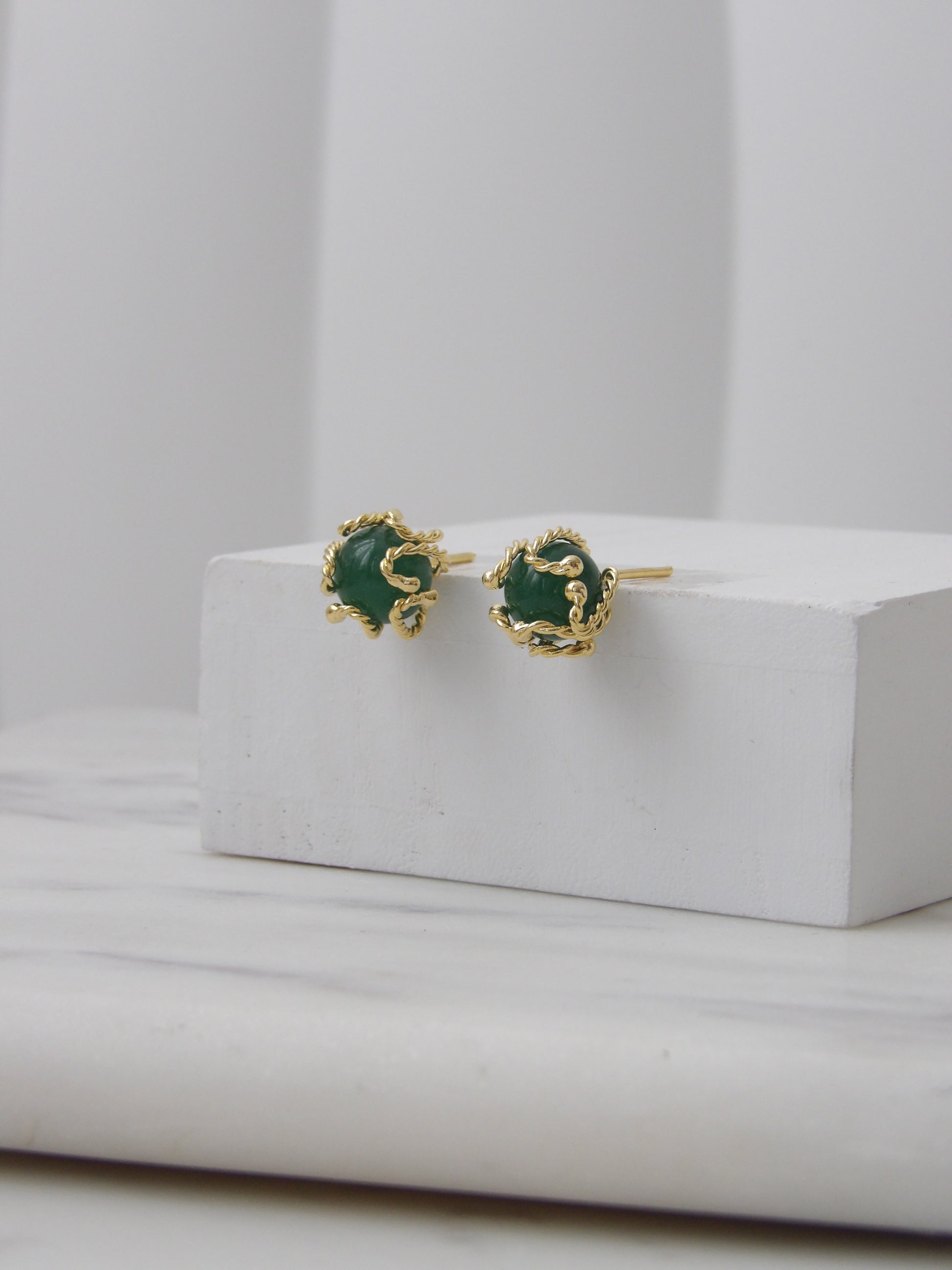 Let yourself be captivated by the deep green elegance of the Verdalia Studs. Handmade in bronze and delicately plated in 24K gold, these stud earrings feature a vibrant stone wrapped in artisan-crafted twisted details—each one slightly unique, just like you.