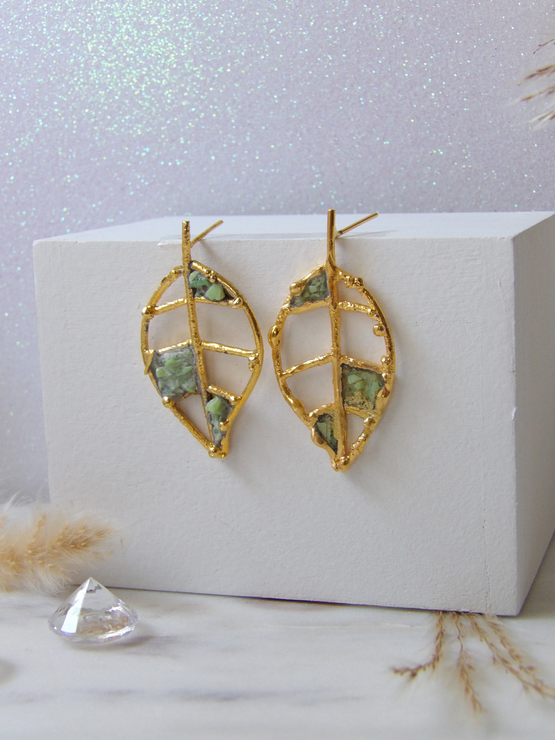 Inspired by nature, designed to shine. The Verdea earrings echo the silhouette of a delicate leaf, featuring artisan-crafted bronze frames and shimmering green molten druzy details that capture light from every angle.