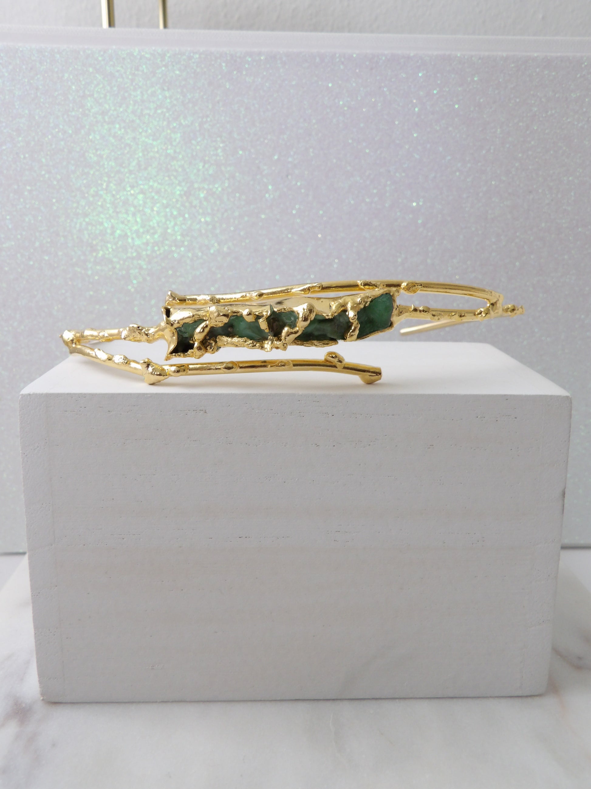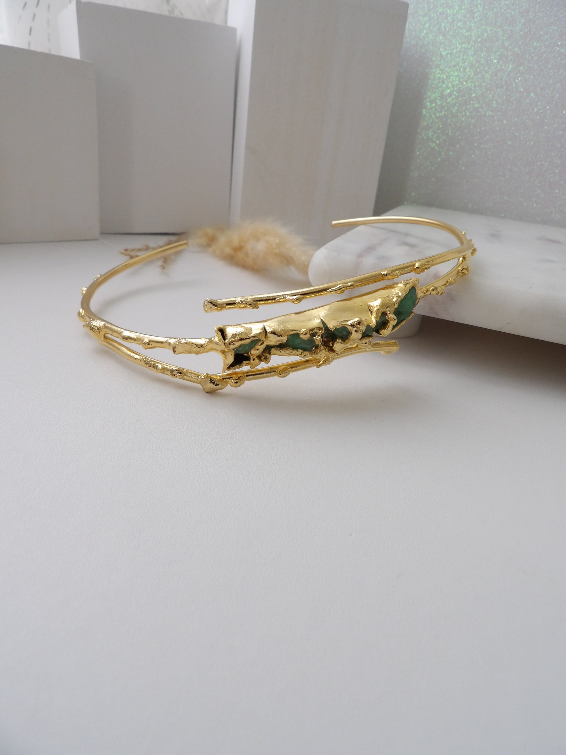 Bold, sculptural, and absolutely unique. VÉRTIKA CHOKER is a handcrafted piece of art made of 24K gold-plated bronze, with molten crystal in emerald tones that flows like precious roots over your skin. Designed to stand out, this choker is part of an exclusive collection that includes a matching bracelet, earrings, and ring. Wear it alone or as a set and turn any look into a style statement. For women who are not afraid to shine with character.