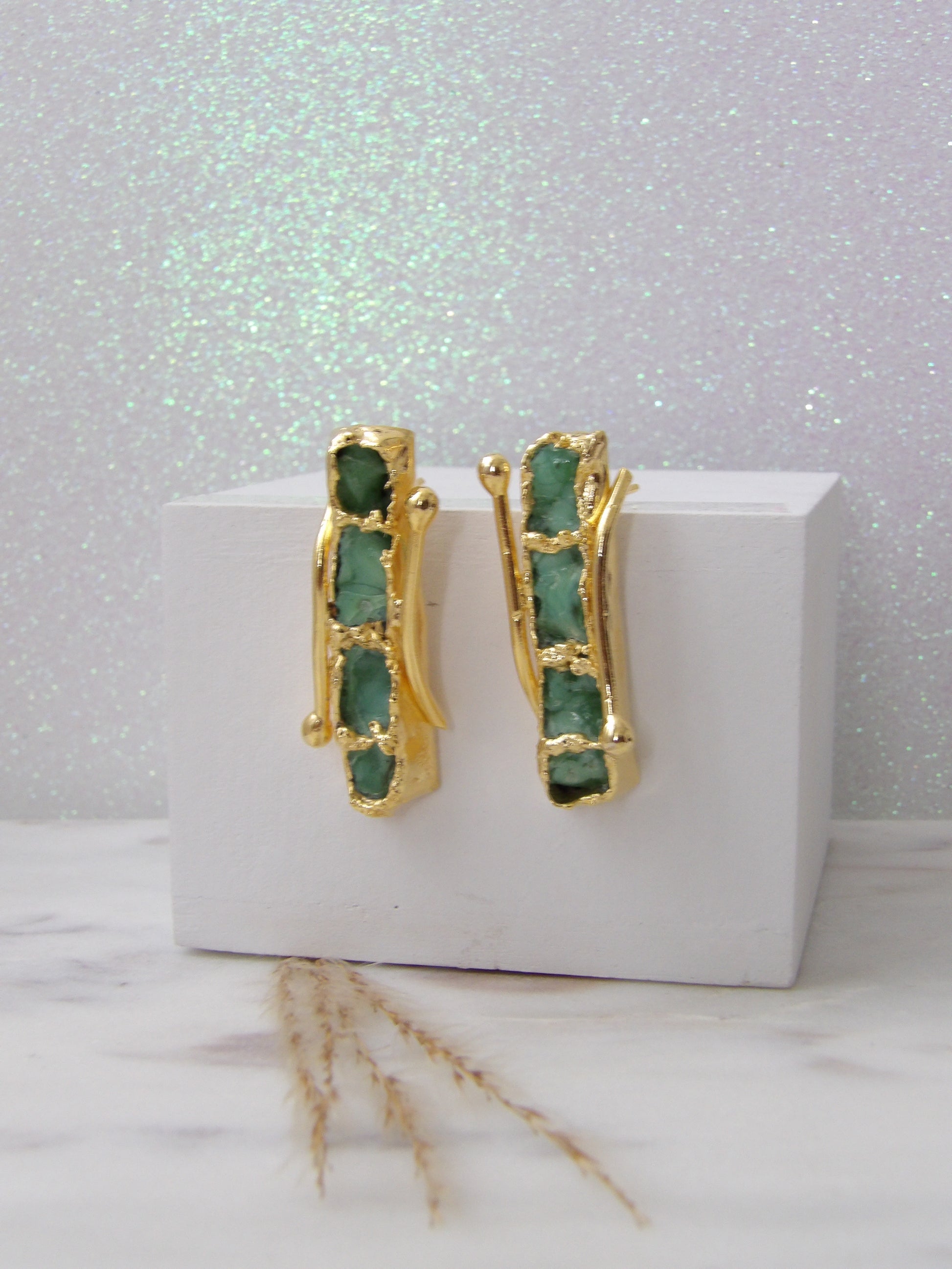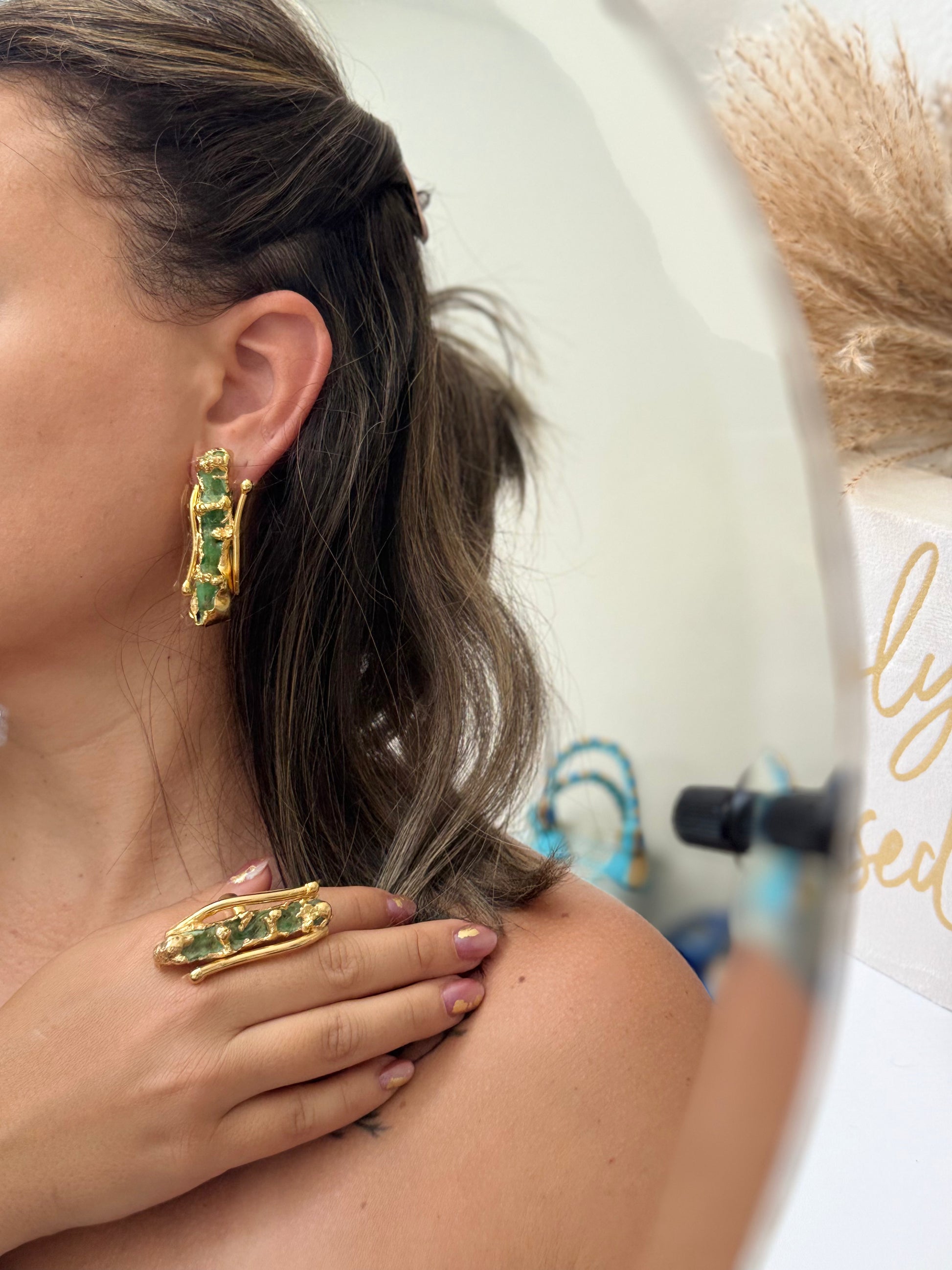VÉRTIKA | Handcrafted earrings in bronze with molten glassA design that ascends with elegance. Inspired by organic vertical shapes, these handcrafted earrings in gold-plated bronze enhance the natural beauty of molten glass, piece by piece.Designed to stand out. Perfect for shining. Pair them with the VÉRTIKA ring for an impactful look.