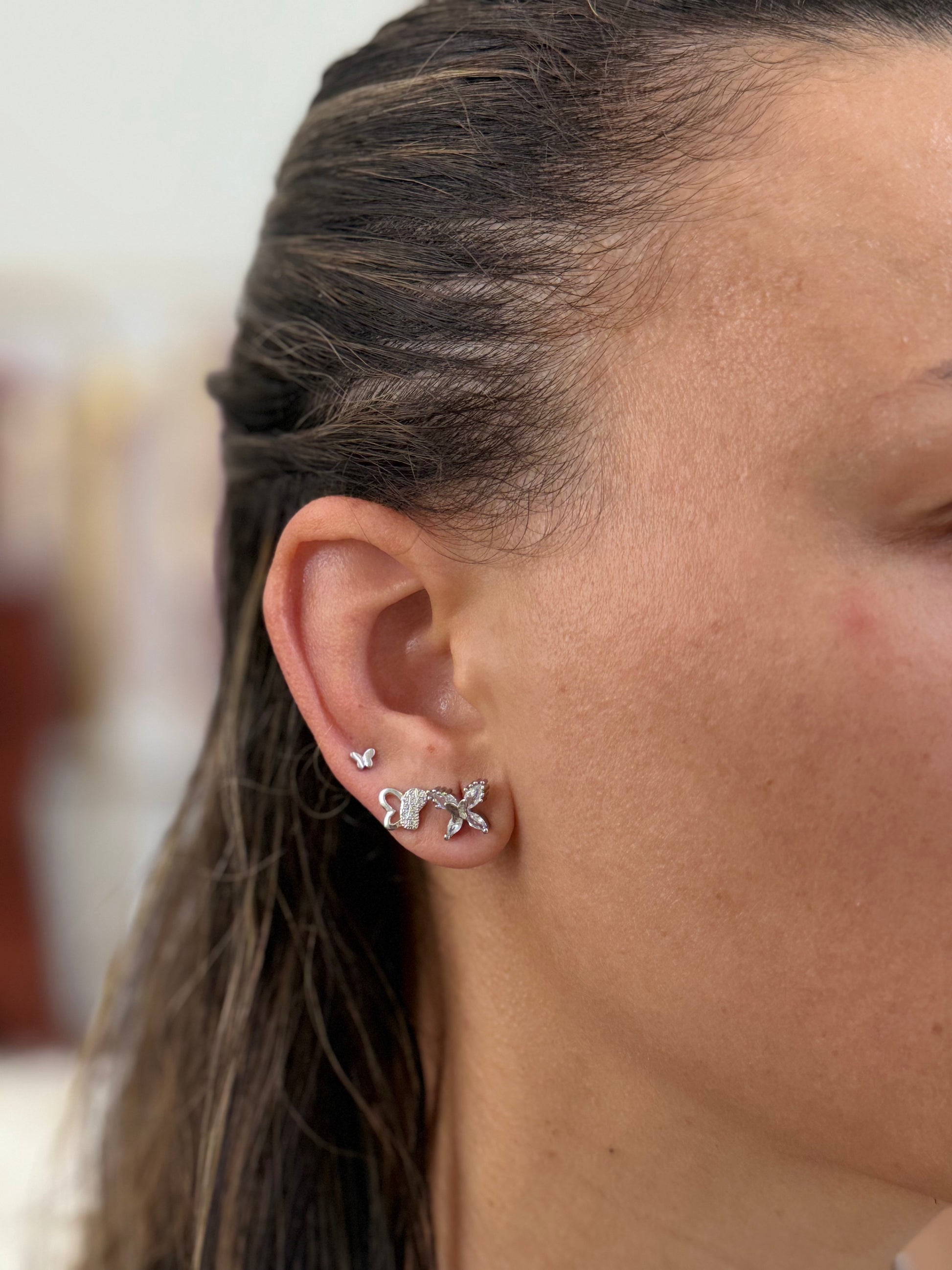 An elegant stud earring set crafted in silver-toned rhodium, designed to celebrate playful charm and radiant beauty. Each piece—ribbons, butterflies, hearts, and more—is adorned with sparkling zirconia to illuminate your everyday look.