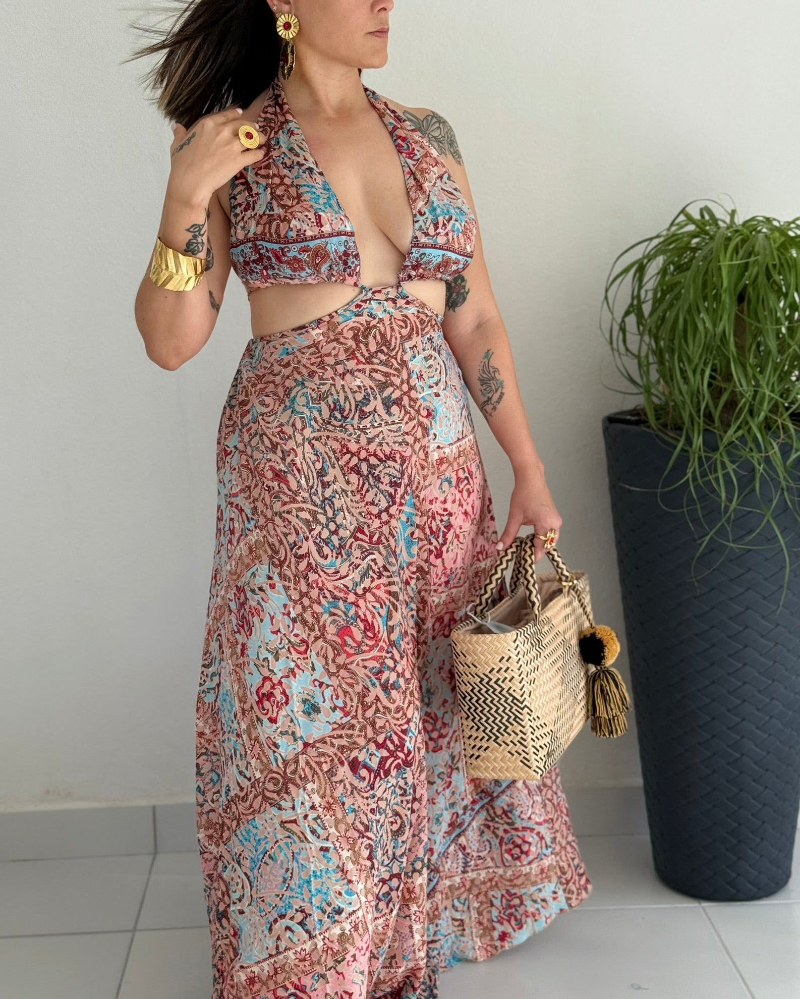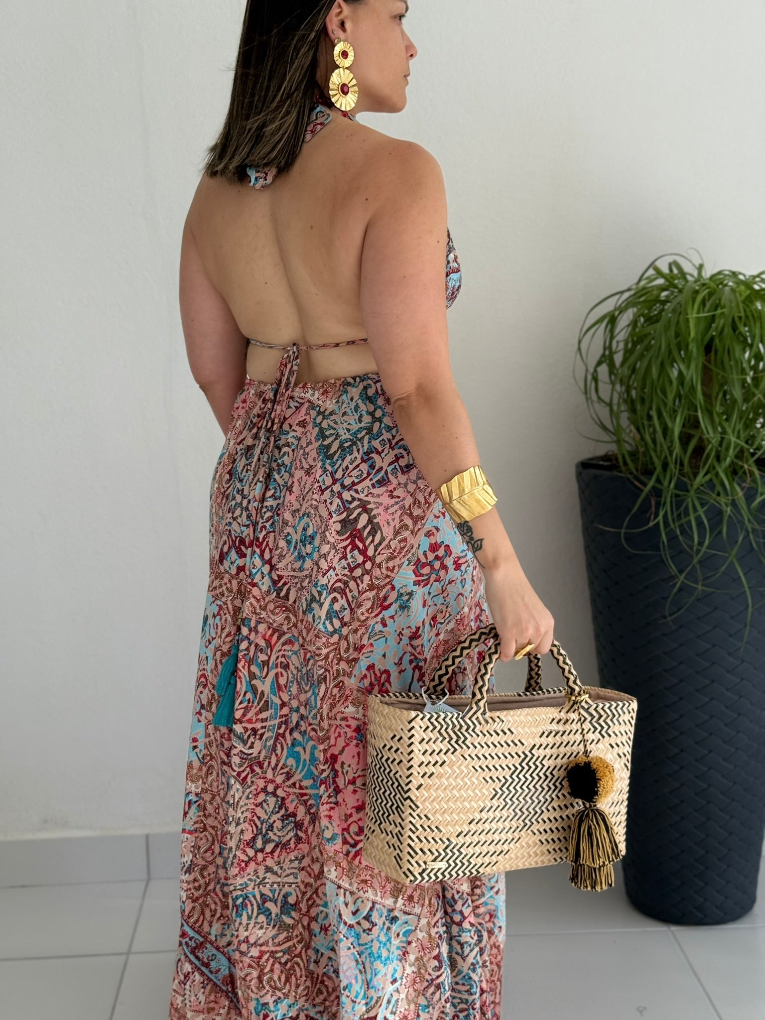 Designed in one size, its fit adapts to different bodies thanks to the delicate tying straps and a subtle elastic at the waist that enhances the figure without squeezing. Each piece is carefully handcrafted in India, where tradition and textile art come together in every stitch (ONE ZIZE)