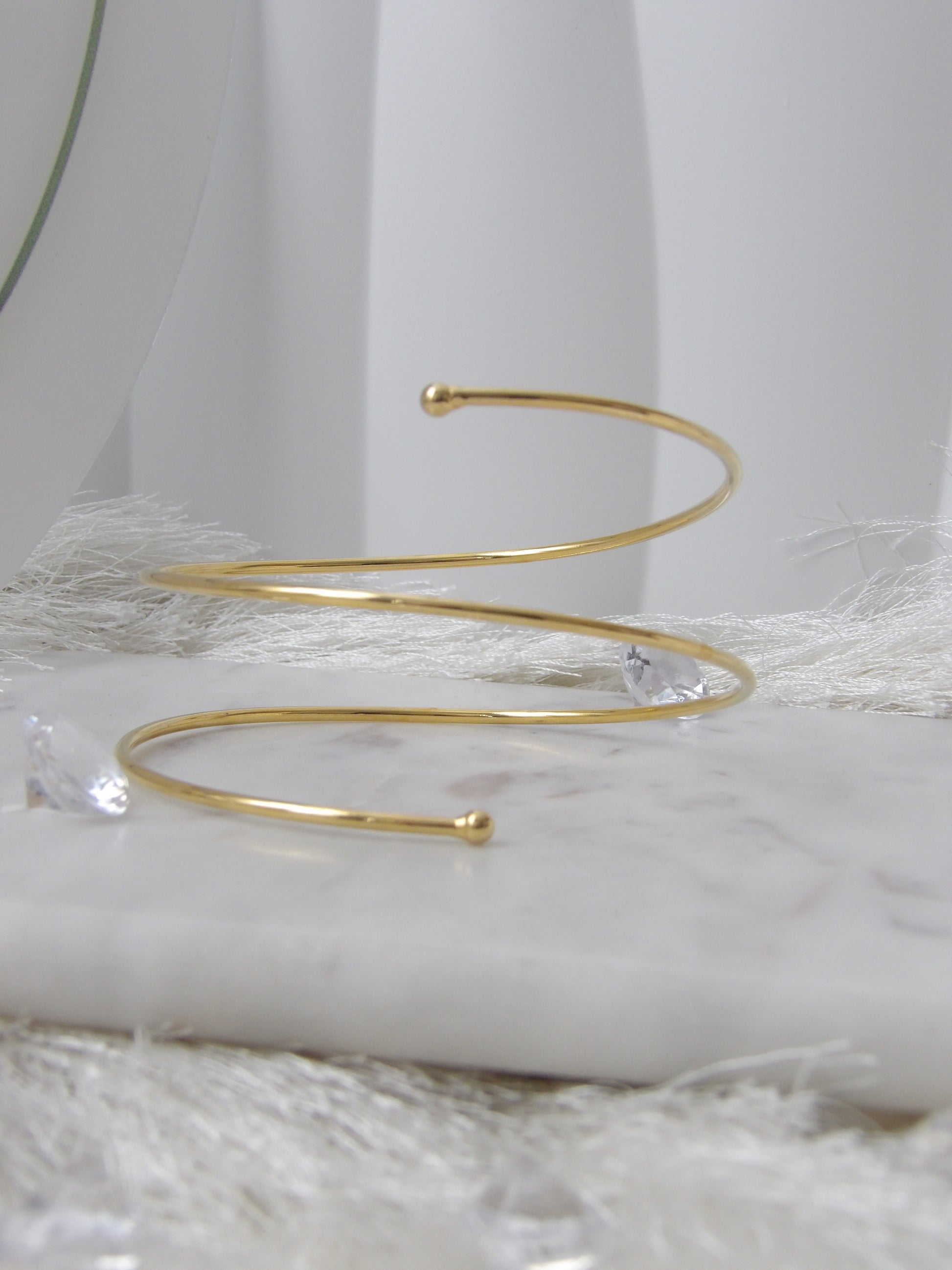 A design that flows like wind and whispers elegance. The Zaphira arm cuff is handmade in bronze and delicately gold-plated, evoking graceful motion through its minimalist spiral silhouette. Light, modern, and sculptural — this piece wraps around your arm like a golden breeze, effortlessly elevating your look.